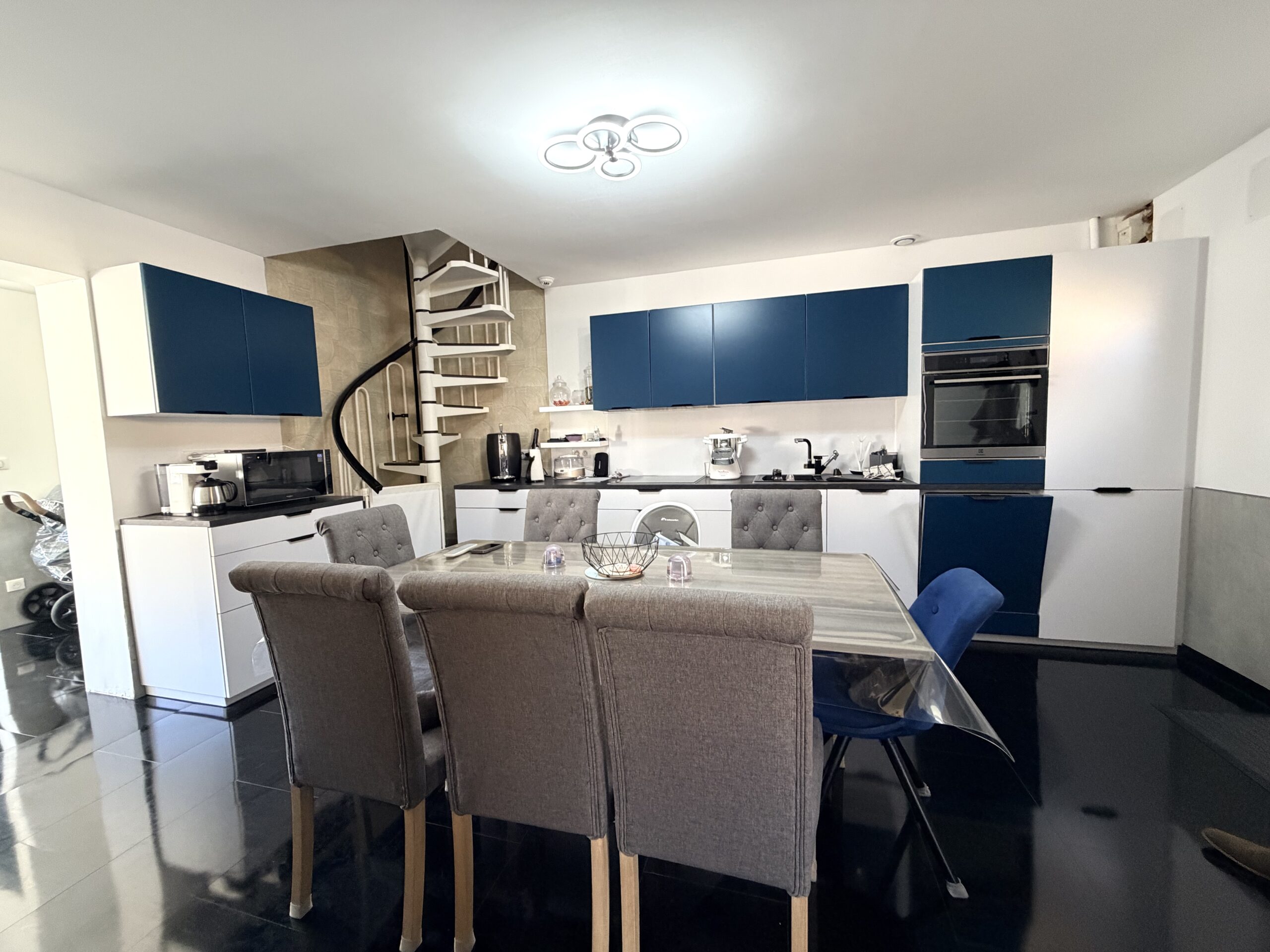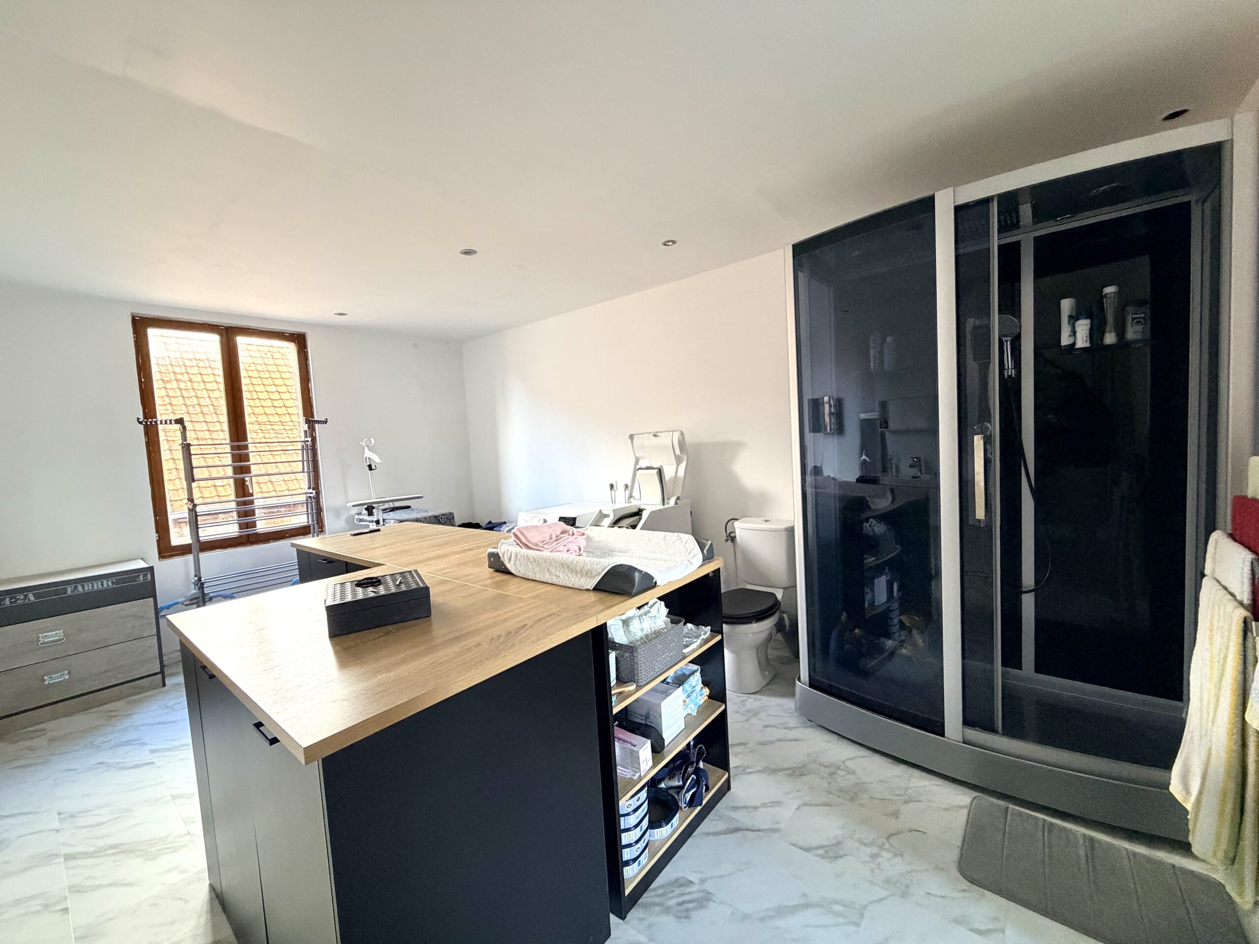 Au rez-de-chaussée la maison dispose d’une cuisine aménagée et équipée ouverte sur un séjour, un deuxième salon séparé pouvant servir de chambre, pièce en attente d’une future salle de douches, WC.