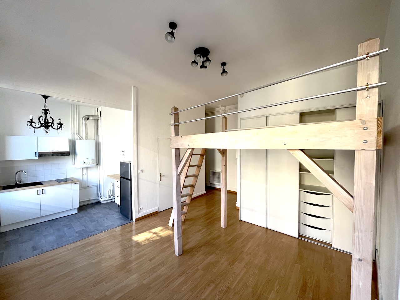 Un séjour spacieux avec un lit en mezzanine et une cuisine ouverte et équipée, une salle de douche et des WC séparés.